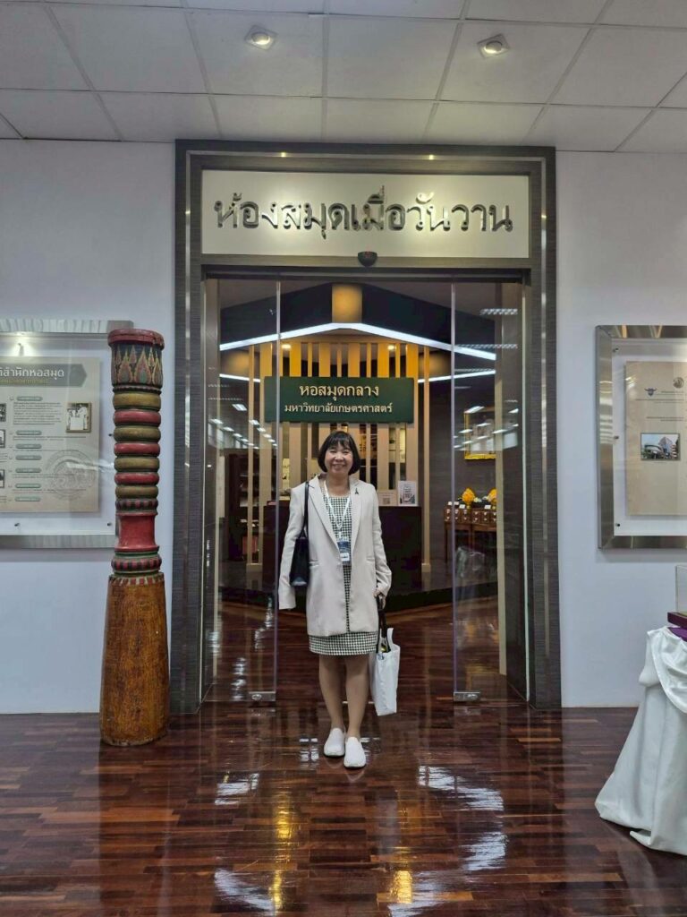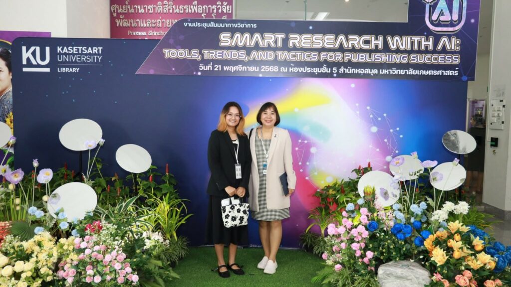 2568 年 11 月 21 日(星期五)08:30–16:30,格乐大学图书馆馆长 Dr. Kobkullaya Ngamcharoenmongkhon 与图书馆信息开发及服务部馆员 Ms. Pensiri Phadungphan 前往泰国农业大学图书馆,参加了 2569 年度学术研讨会,主题为 “Smart Research with AI: Tools, Trends, and Tactics for Publishing Success”。
