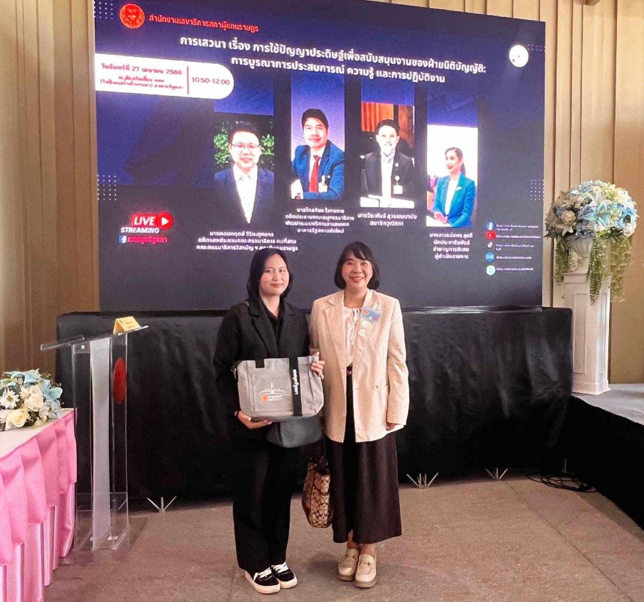On Monday, 27 April, from 08:30 to 16:30, Dr. Kobkullaya Ngamcharoenmongkhon, Director of the Library of Krirk University, and Ms. Kwanjira Napanpong, Librarian (Information Development and Services Division), participated in a seminar on the topic of “NALT Forum : Knowledge for Legislative & Innovation.”The seminar was organized by the Library Division, Information Resources Development Division, and Research and Development Division of the Academic Affairs Bureau, Secretariat of the House of Representatives, in collaboration with the Thailand Science Research and Innovation (TSRI).