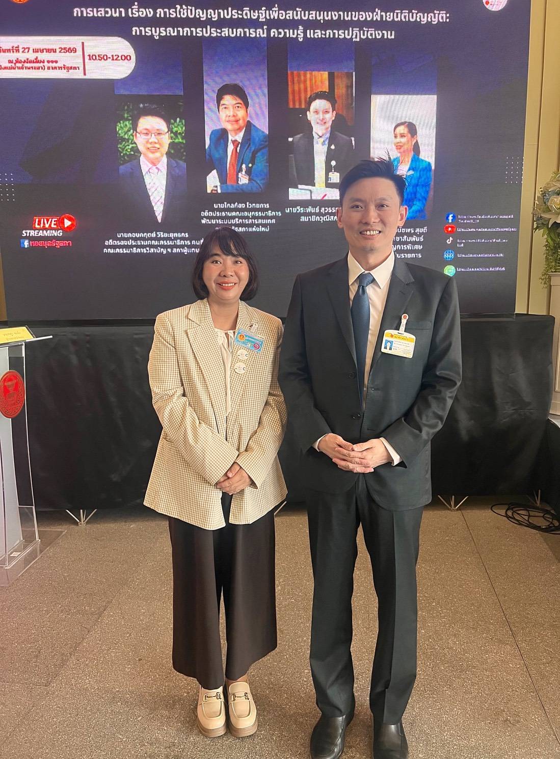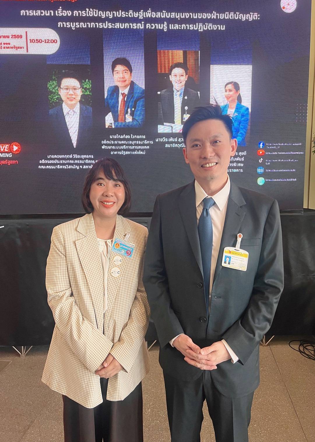 The speakers shared their knowledge and experiences, such as the application of AI in developing websites or applications for legal consultation. One example is “Thanoy” via LINE Official Account (@thanoy.legal), which provides legal advice and support for individuals facing legal issues. AI can also assist in writing books, articles, and research efficiently within a short timeframe.